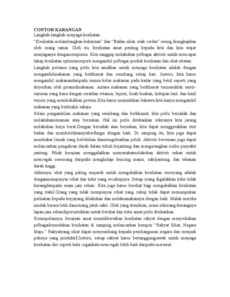 Isi karangan ni x cukup.sepatunya ada 7 perenggan . Karangan bahasa melayu merangkumi pelbagai tema dan tajuk yang berpotensi . Kebersihan badan meliputi kebersihan diri sendiri, seperti mandi, gosok gigi, mencuci tangan, dan memakai pakaian yang bersih. Di bawah ini adalah contoh karangan esai tentang kebersihan diri dan lingkungan sebagai referensi untuk semua siswa. Cara yang lebih mudah ialah seseorang itu perlu menjaga kebersihan diri. Aktiviti mandi dan memakai pakaian yang bersih serta . Karangan ini sesuai untuk peperiksaan upsr. Oleh itu, kita mestilah menjaga kebersihan diri. Menjaga kebersihan merupakan satu amalan yang penting dalam kehidupan kita. Seseorang yang tidak mengekalkan kebersihan diri akan lebih mudah untuk dijangkiti penyakit. Kebersihan adalah salah satu tanda dari keadaan hygene yang baik.